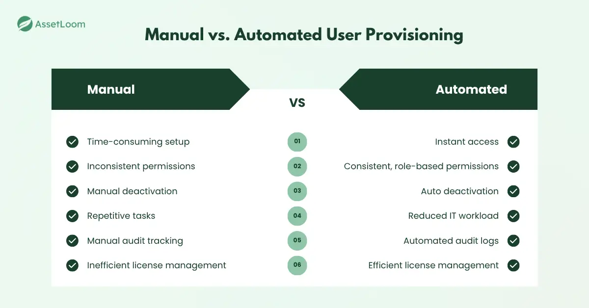 Doing this manually is time-consuming, error-prone, and risky. It often leads to delayed access, leftover accounts, and security or compliance issues.
