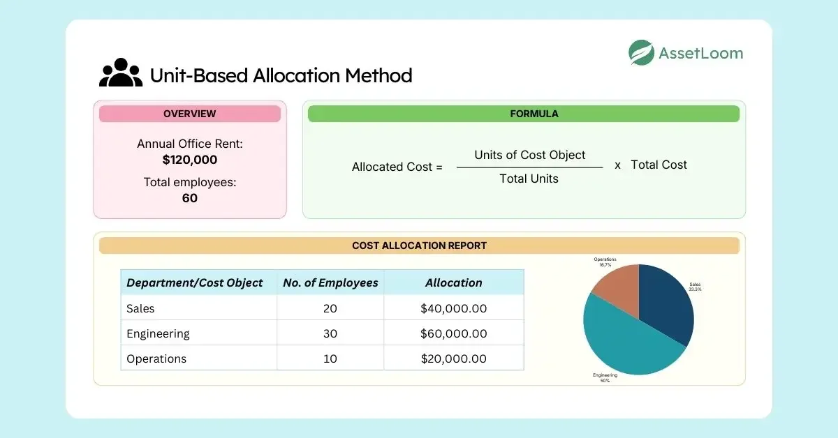 For example, a company pays $120,000 per year for office rent. Sales has 20 employees, Engineering has 30, and Operations has 10, totaling 60 employees.