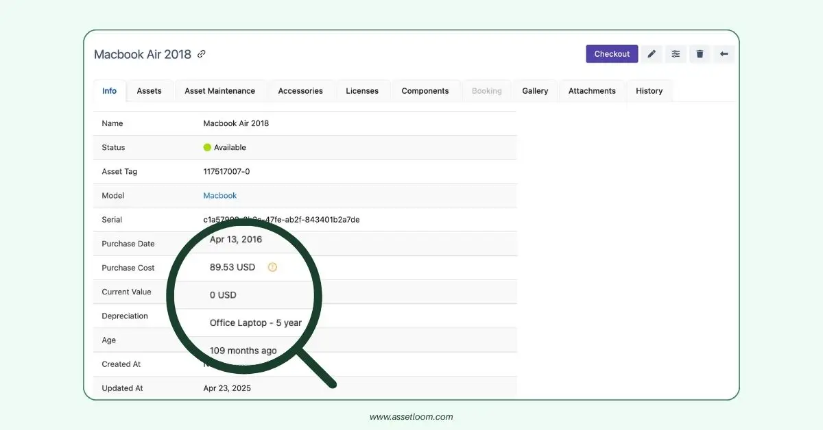 Many ITAM tools nowadays support the full IT asset management cycle, including IT asset disposition. For example, AssetLoom automatically calculates asset value over time using the straight-line depreciation method. It tracks your asset’s current value since purchase, helping you decide whether to resell, refurbish, donate, or recycle.