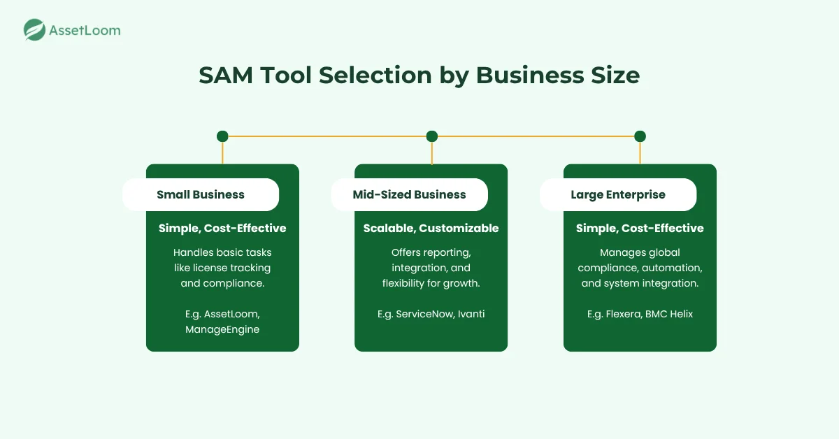 Choosing the right SAM tool depends on your company’s size and complexity. Here’s how the needs vary across different business sizes: