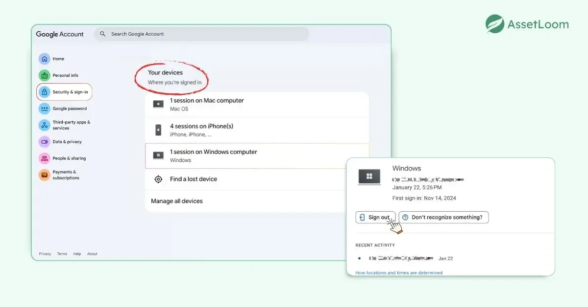 - In Google Account Security (Google Workspace), visit https://myaccount.google.com/. Select “Security & Sign-in” and find “Your devices” to view your logged-in devices. Choose the lost device and log out of your Google account on it.