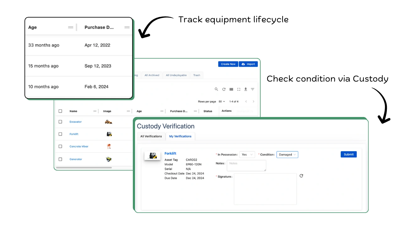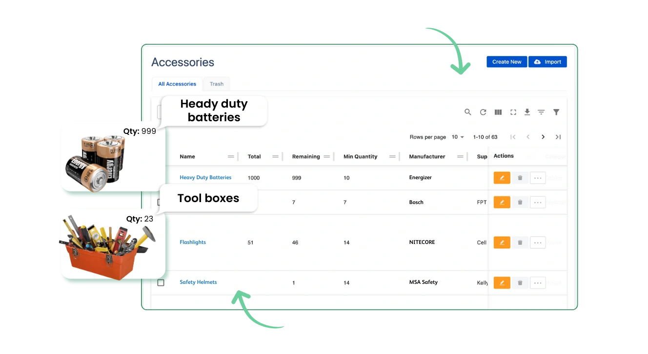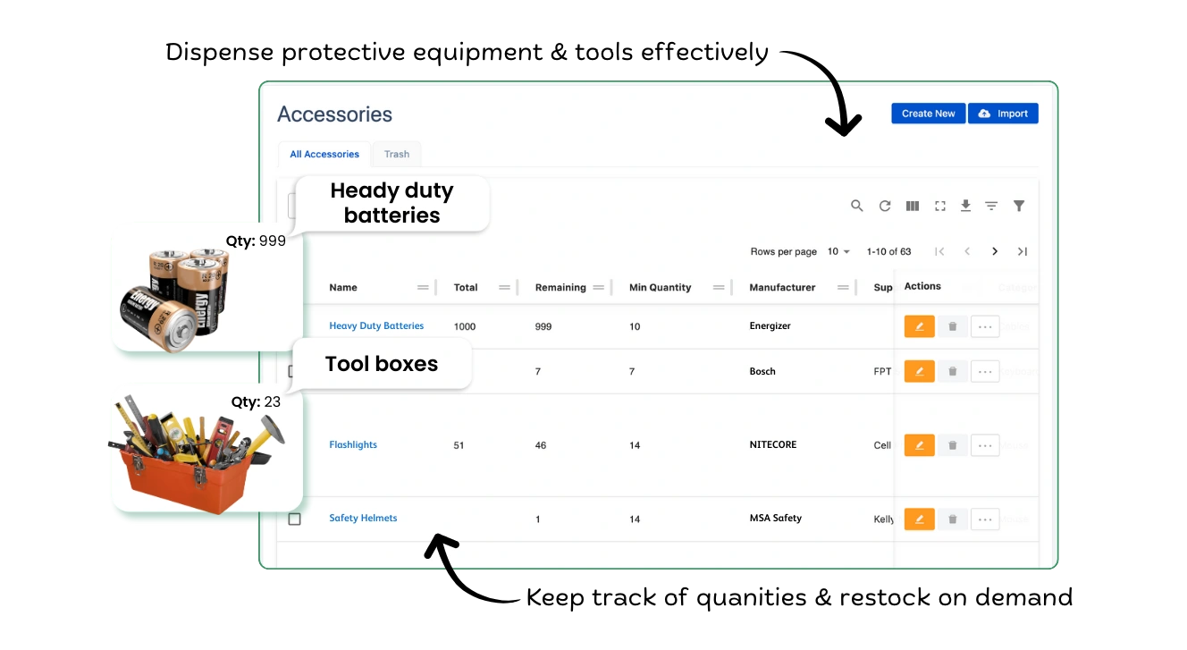 バッテリー、ヘルメット、図面、工具などの必需品を簡単に追跡・管理します。各メンバーに十分な工具と装備を割り当て、中断や危険を防ぎます。